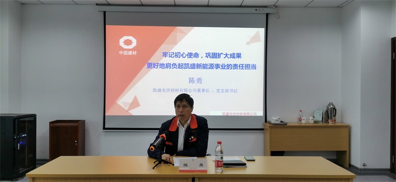 11月5日,中建材蚌埠玻璃工業(yè)設(shè)計研究院副院長、總會計師、凱盛光伏材料有限公司董事長、黨支部書記陳勇到凱盛光伏講授“不忘初心、牢記使命”主題教育專題黨課。凱盛科技集團主題教育第二巡回指導(dǎo)組組長李蓓蓓、成員辛洋到會指導(dǎo)。凱盛光伏黨支部副書記劉翼主持會議并作總結(jié)講話。