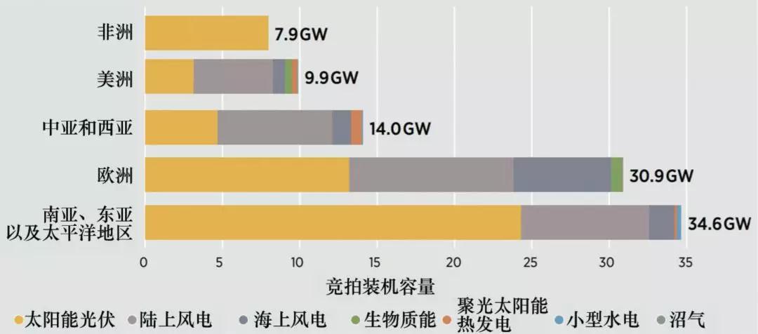 在各類可再生能源發(fā)電技術(shù)中,競(jìng)拍模式應(yīng)用最為廣泛的領(lǐng)域是太陽(yáng)能光伏。統(tǒng)計(jì)周期內(nèi)的全球太陽(yáng)能光伏競(jìng)拍裝機(jī)容量,將近一半由南亞、東亞以及太平洋地區(qū)貢獻(xiàn),剩余部分主要集中在歐洲。與傳統(tǒng)能源相比,由于資源稟賦好、技術(shù)成本持續(xù)下降,上述地區(qū)太陽(yáng)能光伏發(fā)電的競(jìng)爭(zhēng)力日益增強(qiáng)。此前,中國(guó)在總計(jì)10輪的太陽(yáng)能光伏發(fā)電裝機(jī)競(jìng)拍中,共中標(biāo)5GW,平均價(jià)格為 67.8 美元/兆瓦時(shí)(約合人民幣0.48元 / 千瓦時(shí))。在2018年菲律賓舉行的一輪50MW 太陽(yáng)能光伏發(fā)電裝機(jī)競(jìng)拍中,最低報(bào)價(jià)僅有43.9 美元/兆瓦時(shí)(約合人民幣0.31 元 / 千瓦時(shí))。