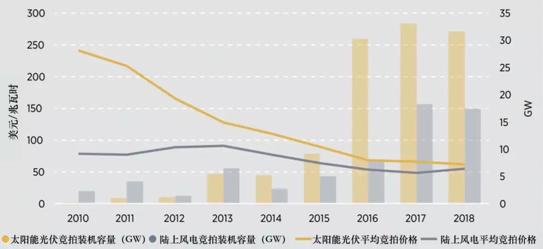 2010-2018年全球太陽(yáng)能光伏與陸上風(fēng)電的競(jìng)拍裝機(jī)容量和平均競(jìng)拍價(jià)格