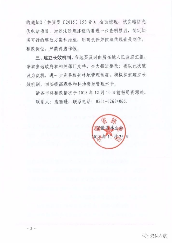 安徽省林業(yè)局《關(guān)于開展光伏電站違法違規(guī)使用林地整改工作的通知》文件要求全面梳理、核實(shí)轄區(qū)內(nèi)光伏電站項(xiàng)目,對(duì)違法違規(guī)建設(shè)的要查明原因,抓緊整改。整改情況請(qǐng)于2018年12月7日前報(bào)市林業(yè)局。