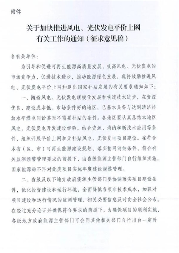 國(guó)家能源局公布加快推進(jìn)風(fēng)電、光伏平價(jià)上網(wǎng)征求意見