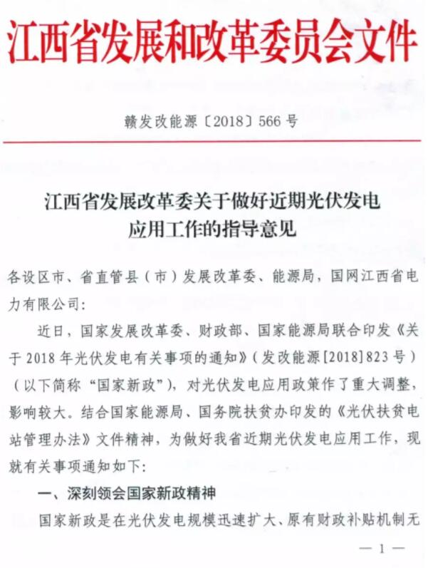 江西省發(fā)改委發(fā)布《關(guān)于做好近期光伏發(fā)電應(yīng)用工作的指導(dǎo)意見》